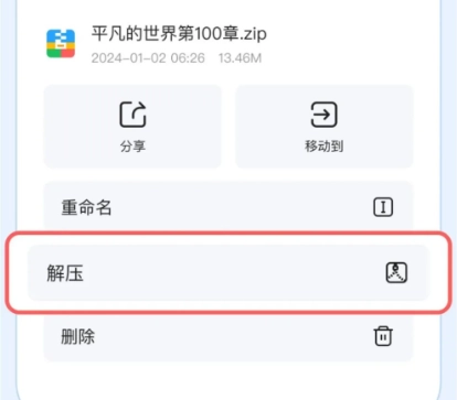 选择需要解压的压缩文件并点击右边的更多按钮。