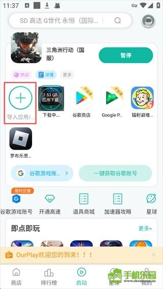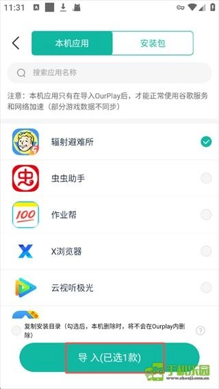 选择你需要加速的软件【本机应用需导入0urPlay后,方可正常使用谷歌服务与网络加速(部分游戏数据可能不同步)】