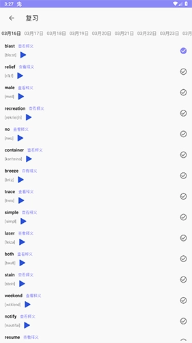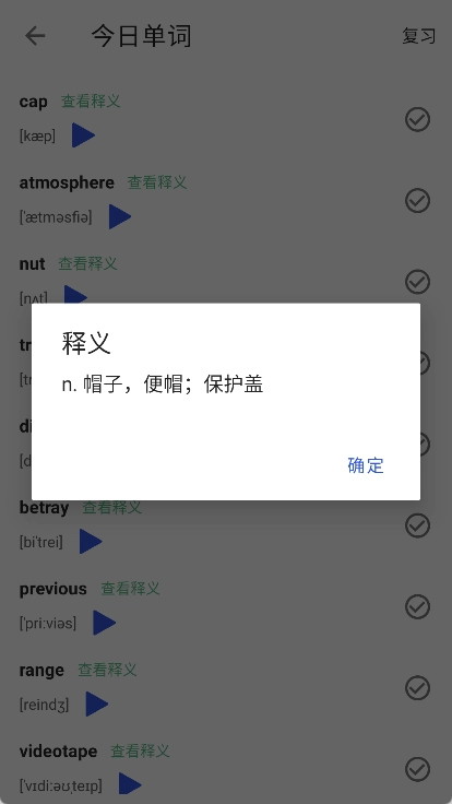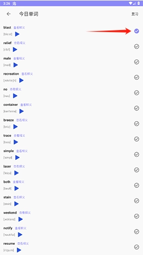 在背单词的页面中,你可以查看每个单词的释义和读音,当你记住这个单词后,点击并勾选【√】按钮即可。