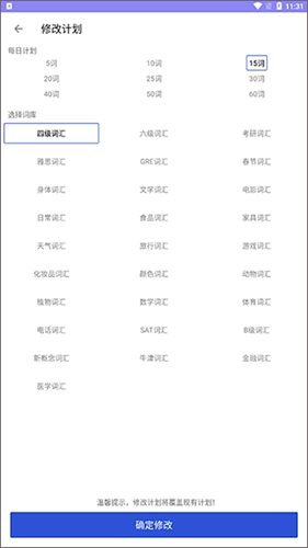 根据需求选定每日背词数量与词库,点击【确认修改】按钮。