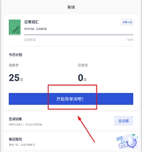 回到首页后,点击【开始背词】按钮,即可进入每日计划的学习环节。