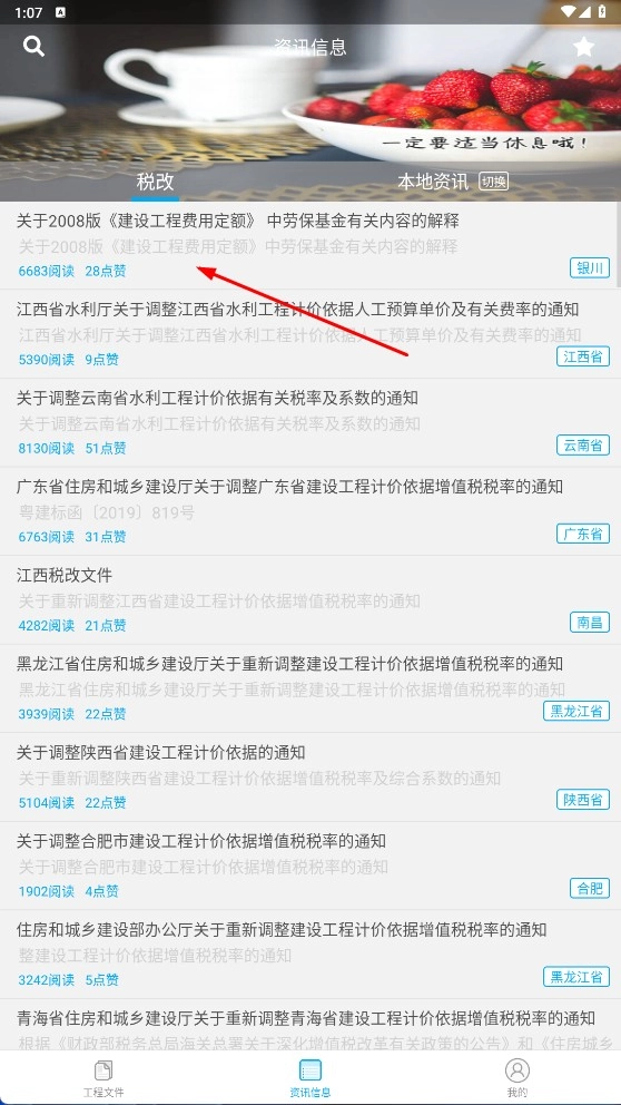 切换到【资讯信息】页面,查看各地与造价相关的政策通知,像税改类文件这类内容都可以浏览,以此来熟悉行业规范。