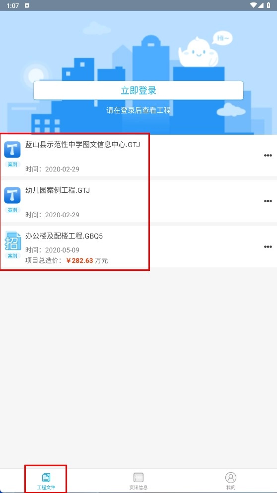 在【工程文件】页面,您可以浏览各类造价案例的工程文件,登录账号后即可查看更详细的工程内容。