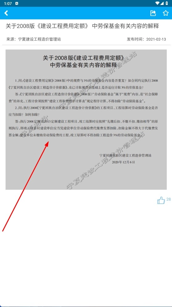 点击具体资讯(例如劳保基金相关解释),查看详细内容,从而获取造价工作的政策依据。