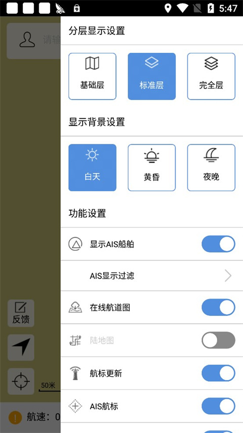 在“设置”里选择“标准层”,就能清楚看到长江干线上游那片绿色的“航路”啦。