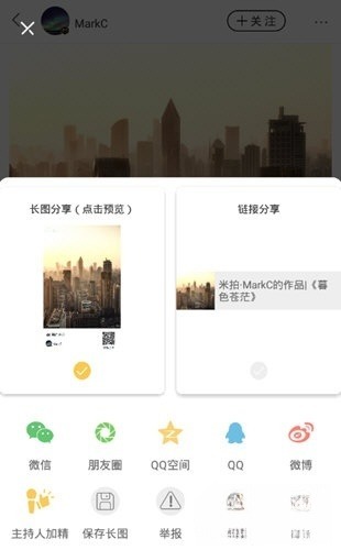 只需点击【保存长图】就行,不过要留意的是,分享出去的图片上会带有米拍水印、作品名称、摄影师信息,还有对应的二维码。