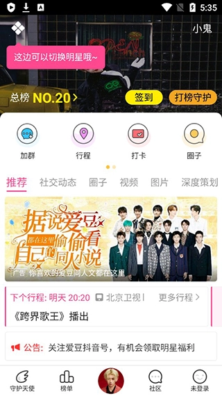 2、进入软件之后,首页如下图所示,你可以加你喜欢明星的群聊、圈子等;
