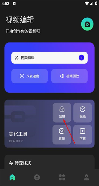 打开软件后,进入主界面,浏览视频编辑相关功能,点击美化工具中的滤镜选项,即可进入视频选择页面。