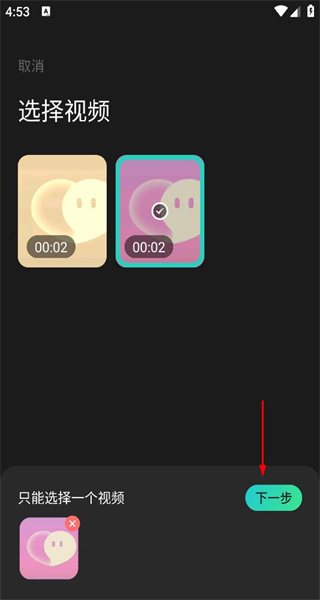 进入视频选择页面,选定目标视频素材,在确认已选中后,点击“下一步”按钮,即可进入滤镜编辑页面。