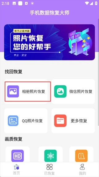 打开应用首页后,点击“相册照片恢复”选项(若有需要,也可以选择微信/QQ照片恢复等其他恢复类型)。