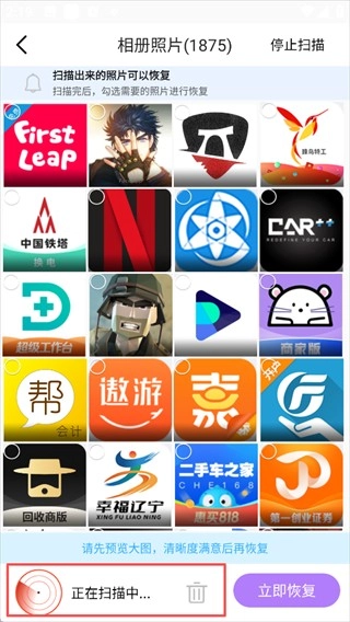平台会自动扫描设备里能够恢复的照片,请耐心等待扫描结束。