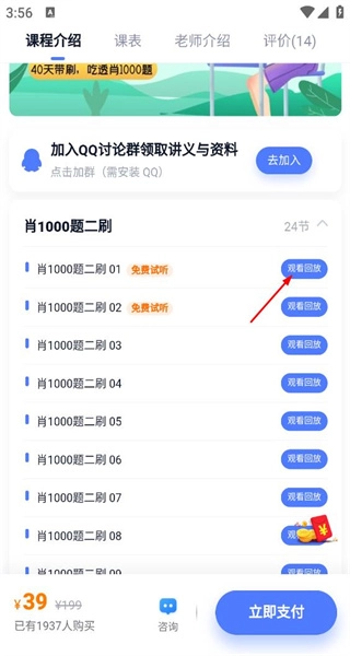 进入课程详情页面后,你可以查看课程介绍、课表等相关信息,然后点击对应课程章节的“观看回放”按钮来学习课程内容。