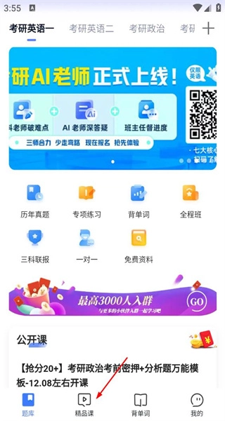 打开软件,进入首页后,先查看历年真题、专项练习等功能模块,接着点击精品课,进入课程分类页面。