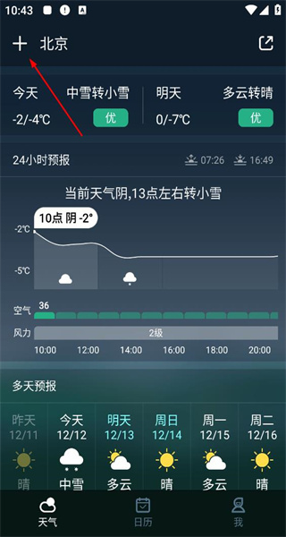 打开软件后,查看当前显示城市的天气信息,点击左上角的加号按钮,进入城市管理页面。