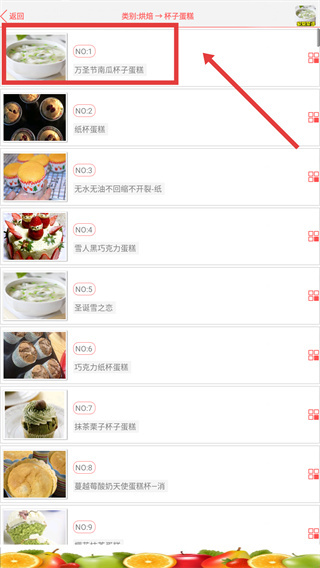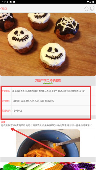 在烘焙子分类中,挑选【杯子蛋糕】类别,点击想要查看的食谱(例如“万圣节南瓜杯子蛋糕”),就能浏览具体的制作步骤了。