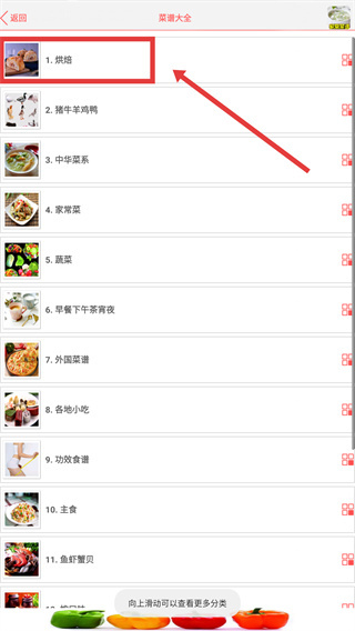 在【菜谱大全】页面,点击进入【烘焙】分类,即可看到烘焙类食谱的子分类列表,通过该列表能精准筛选出目标食谱。