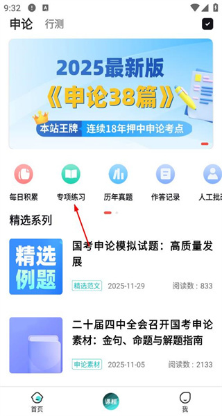 打开软件后,进入首页,查看每日积累等功能,点击专项练习选项进入对应练习页面。