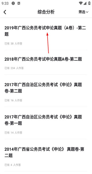 查看筛选后的综合分析类题目列表,从中选定2019年广西公务员考试的申论真题题,准备着手开始练习。