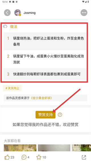 根据菜品详情页里的【做法】步骤来操作,学习相关烹饪技巧,完成烹饪后可以点击【赞赏支持】来鼓励作者。