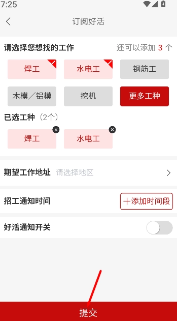 按照页面上的提示选择对应工种,填写期望薪资等相关条件,在确认所有信息准确无误后,提交订阅内容。
