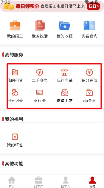 在服务中心可以进入我的租赁、二手交易、积分记录等模块,对相关资料和操作事项进行管理。