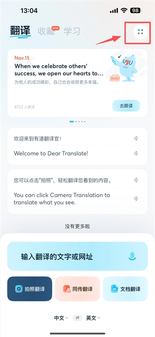 1、打开翻译类应用,点击右上角的四点菜单图标,进入个人功能界面。