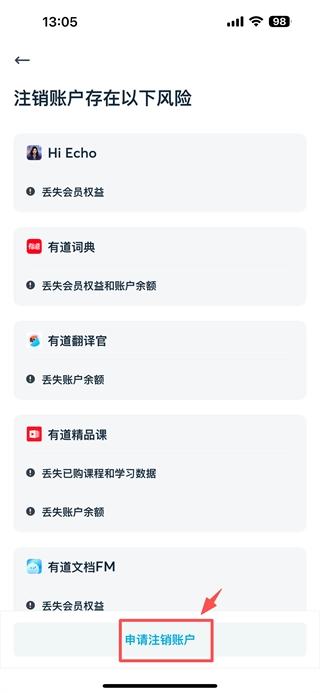 4、进入注销风险提示页面后,点击“申请注销账户”按钮,即可完成账号注销流程。