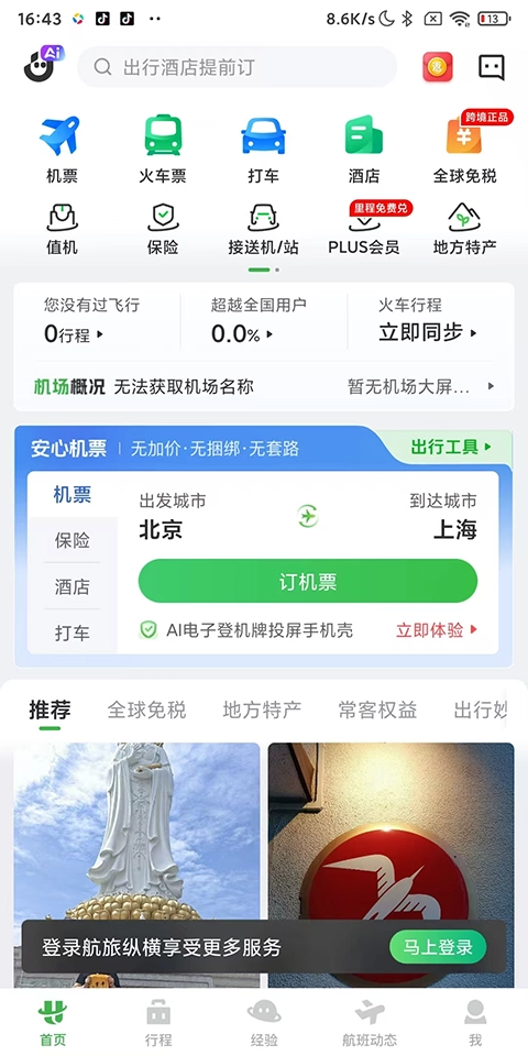 航旅纵横App对旅游大神和出差达人而言是不可多得的出行利器,具备行程自动导入管理、机票验真、航班动态查询、前序航班追踪、手机值机办理、机票搜索比价等实用功能,助您轻松搞定各类出行事宜。