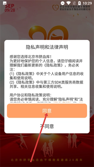 1、仔细阅读【北京市脐血库】发布的【隐私声明和法律声明】以及相关联的【隐私政策】,在确认无误后点击【同意】按钮,即可进入应用的主功能界面。