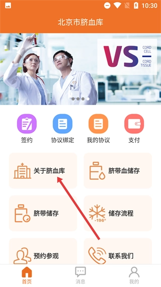 2、进入主界面后,点击【关于脐血库】选项,能够了解该机构的建库背景、服务范围等相关信息。