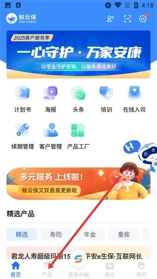 1、在鲸云保首页点击底部【产品】,进入产品页面。