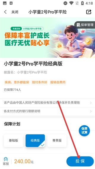 3、在详情页面点击【投保】,进入保费试算页面。