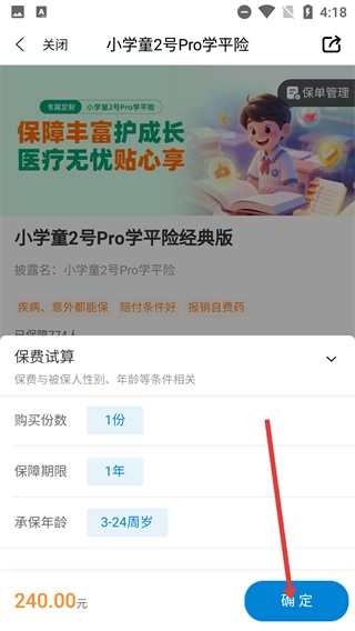 4、在保费试算页面确认好购买份数、保障期限、承保年龄等相关信息后,点击【确定】按钮,即可完成投保操作。