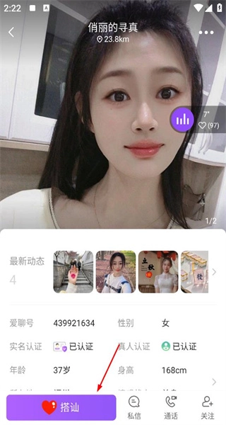4、在同城列表里找到“俏丽的寻真”,进入其个人主页后,可以查看动态和身高信息,点击搭讪按钮就能开启交流。