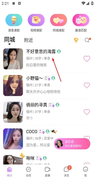 1、打开软件后,进入同城界面,看到包括“不好意思的海露”在内的用户信息,可选择感兴趣的用户。