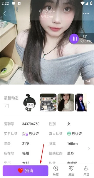 3、回到同城列表后,点击“小野猫”的账号进入其个人主页,查看该账号的认证信息、年龄等内容,接着点击搭讪按钮向对方发起聊天。