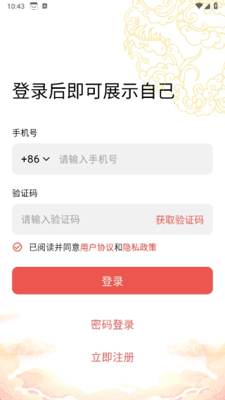 1、打开软件进入登录界面,可通过输入手机号与验证码快速登录,也能使用手机号和密码完成登录操作;