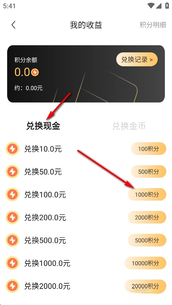 点击【兑换现金】,再选择对应积分