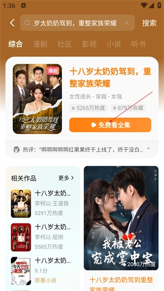 2、在搜索结果页面,点击【免费看全集】按钮,即可进入剧集播放页面。