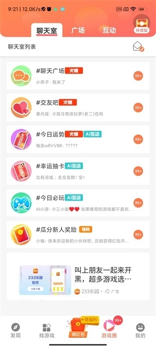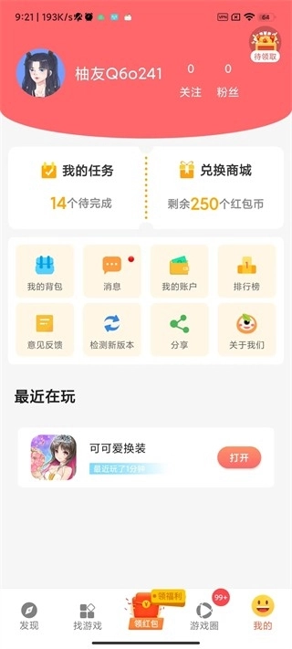 1、完成柚子乐园的安装后打开软件,映入眼帘的是发现、找游戏、领红包、游戏圈和我的这五个板块;