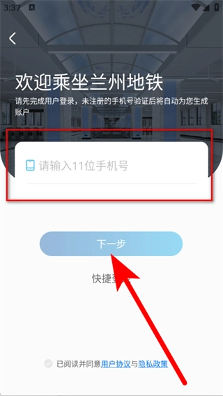 3、在登录页面,输入手机号后,点击下一步。