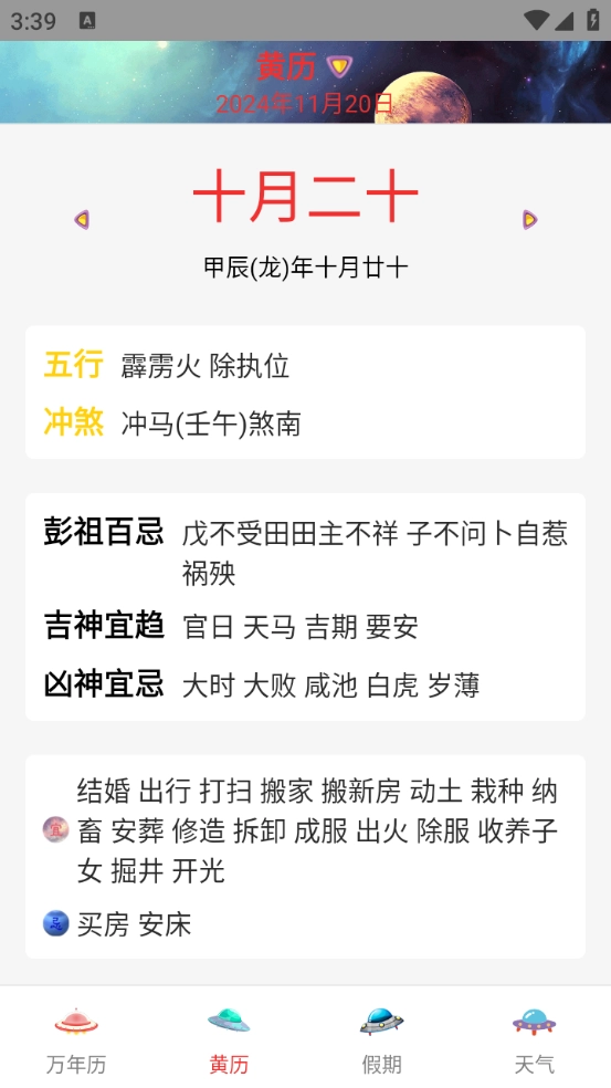 3、黄历页面主要提供了良辰吉日,可以进行参考。