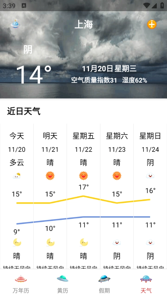 3、实时天气预报功能,提供24小时及十五日天气预报服务,为您的日常生活与工作出行提供贴心保障。