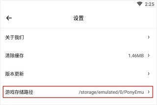 在这里就能查看版本更新信息和游戏的存储路径,之前玩家的所有游戏都会被保存到:/storage/emulated/0/PonyEmu 这个位置。