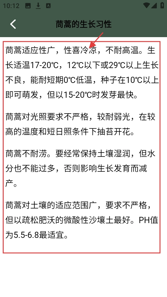 3、进入茼蒿生长习性的详情页面,了解它在温度、光照等方面的具体要求,从而掌握种植茼蒿的关键要点。