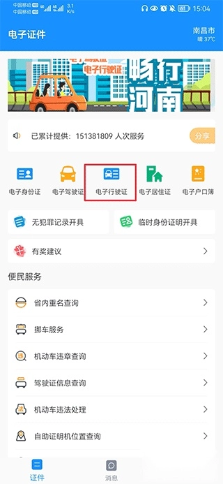其他功能:支持证照授权管理、挪车服务申请等,也可在线快速办理个人电子身份证。