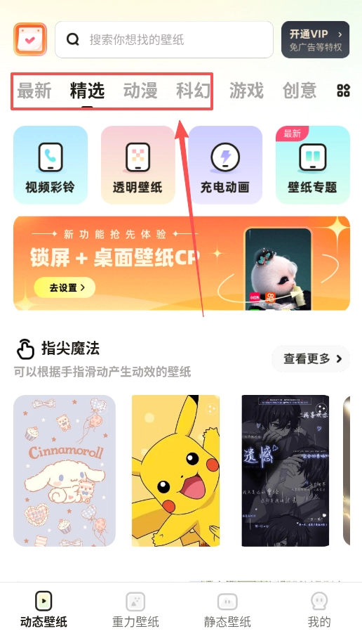 1、第一步先探索首页,顶部那些类似标签页的“精选、动漫、科幻”是内容分类的入口,你可以从这里着手寻找自己喜欢的风格。