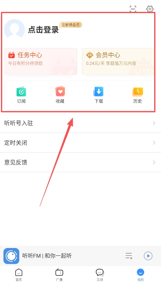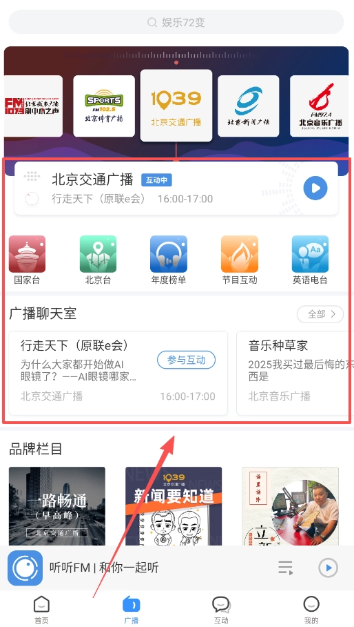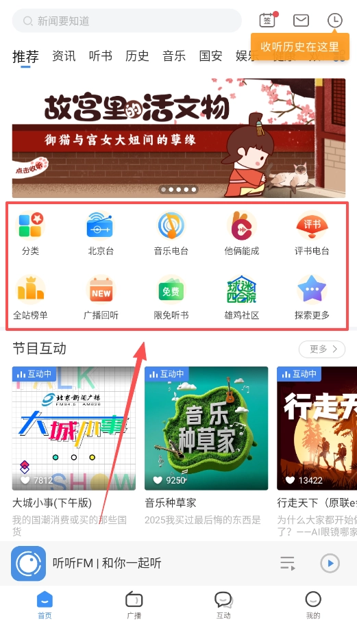 4、若想回听错过的精彩内容,除了在“我的”页面查找历史记录外,也可以前往“广播”页面的“节目互动”区域。