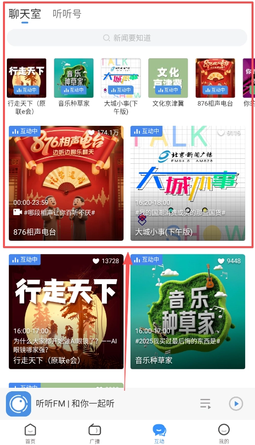 2、要是想发言或者看看大家都在聊些什么,切换到“互动”页面就行。这个页面就像“广播聊天室”一样,所有能参与互动的节目都会在这里列出来。