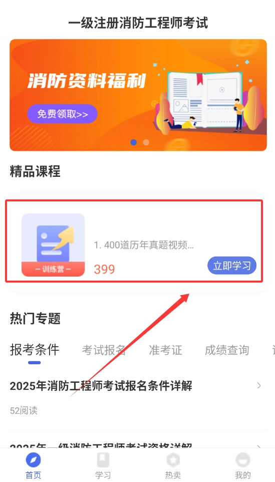 1、打开软件进入首页后,顶部会显示资料福利横幅,点击该横幅即可免费领取备考资料,操作十分便捷。
